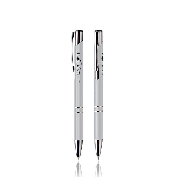 Esferográfica de plástico, clip de metal. Escrita preta, sistema pulsar. Clip em metal prateado. Detalhes prateados na ponta e nos dois anéis.