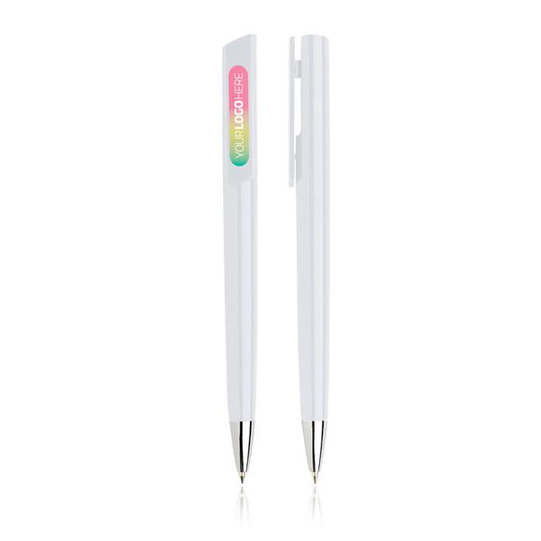 Esferográfica em plástico. Uma esferográfica com um detalhe prateado e restante corpo de uma cor. Clip grande e liso para oferecer boa área de gravação. Com escrita azul, esta esferográfica tem sistema pulsar no clip.