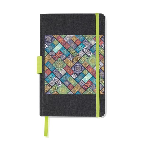 Bloco de notas A5 com capa em PU e porta-esferográfica. Com 91 folhas pautadas de 80g, este bloco tem uma capa em PU térmico, com uma textura visualmente semelhante a tecido. Detalhes coloridos abrilhantam a capa preta. Destaque para o porta-esferográfica, para que nunca perca a sua caneta favorita de vista.