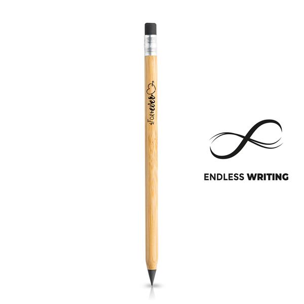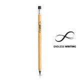 Lápis infinito com corpo em bambu. Com uma ponta especial em carbono, e através da oxidação, este lápis vai escrever para sempre e nunca mais precisará de outro! Com uma estrutura muito mais resistente que a de um lápis regular e inserido na gama ecofriendly com um corpo em bambu. Este lápis não precisa de ser afiado e contém uma borracha para apagar a sua escrita. O conceito de infinito nunca fez tanto sentido.