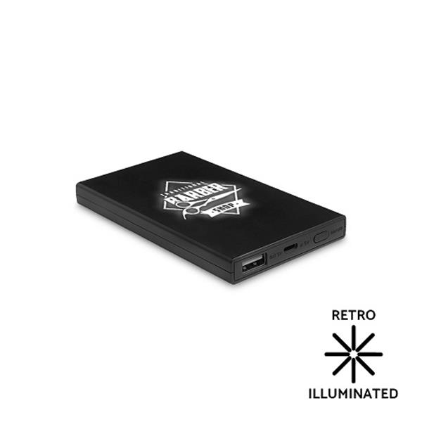 Power bank em alumínio 4000mAh, retro iluminado. Moderno e especial. Grave o seu logo e veja como a iluminação interior deste Power bank destaca a sua marca. Cabo incluído (USB – MicroUSB).
