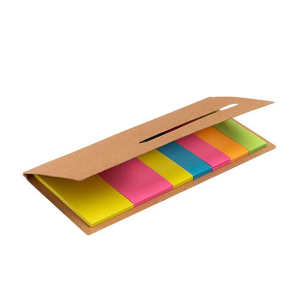 Bloco de notas adesivas. Este conjunto de notas adesivas incluí notas adesivas amarelas e rosas (20un/cor) e mini notas adesivas em amarelo, azul, rosa, laranja e verde (20un./cor). A capa contém uma janela que permite ver as cores do interior, dando um ar diferente à capa branca.