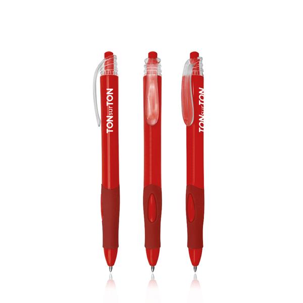 Esferográfica de plástico, detalhes transparentes. Escrita preta, sistema pulsar. Esferográfica com pega e corpo coloridos e clip transparente. Corpo fino. Divulgue a sua marca com este brinde.