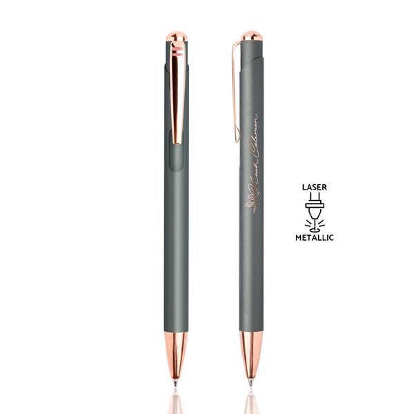 Esferográfica em metal, com detalhes rosa gold. Uma esferográfica feminina, com cores modernas e atrativas. Os detalhes rosa gold atribuem-lhe destaque e elegância. Na gravação a laser, o seu design ficará a combinar com os detalhes. Com sistema pulsar. Esta esferográfica é de escrita azul.